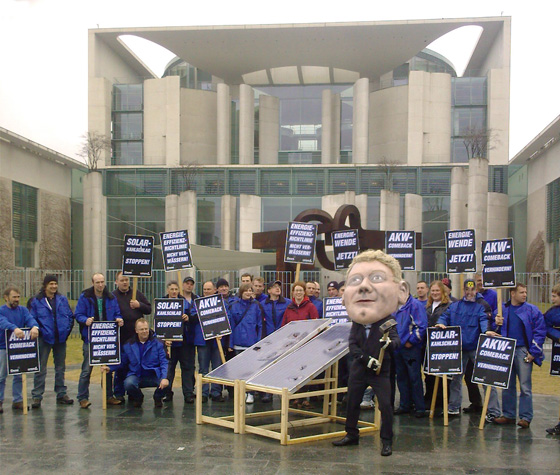 Bei der Aktion ließen wir Schauspieler mit Röttgen- und Rösler-Masken mit Hämmern auf ausgemusterte Fotovoltaikmodule und Dämmplatten – symbolisch für die Solarkürzungen und die Verwässerung der Energieeffizienzrichtline – losgehen. Unter den Sprechchören der Aktiven schaffte es aber schließlich eine Schauspielerin mit Merkel-Maske die beiden Minister abzudrängen. Doch zu diesem Zeitpunkt hatten diese beiden wichtigen Bestandteile der Energiewende schon großen Schaden genommen.