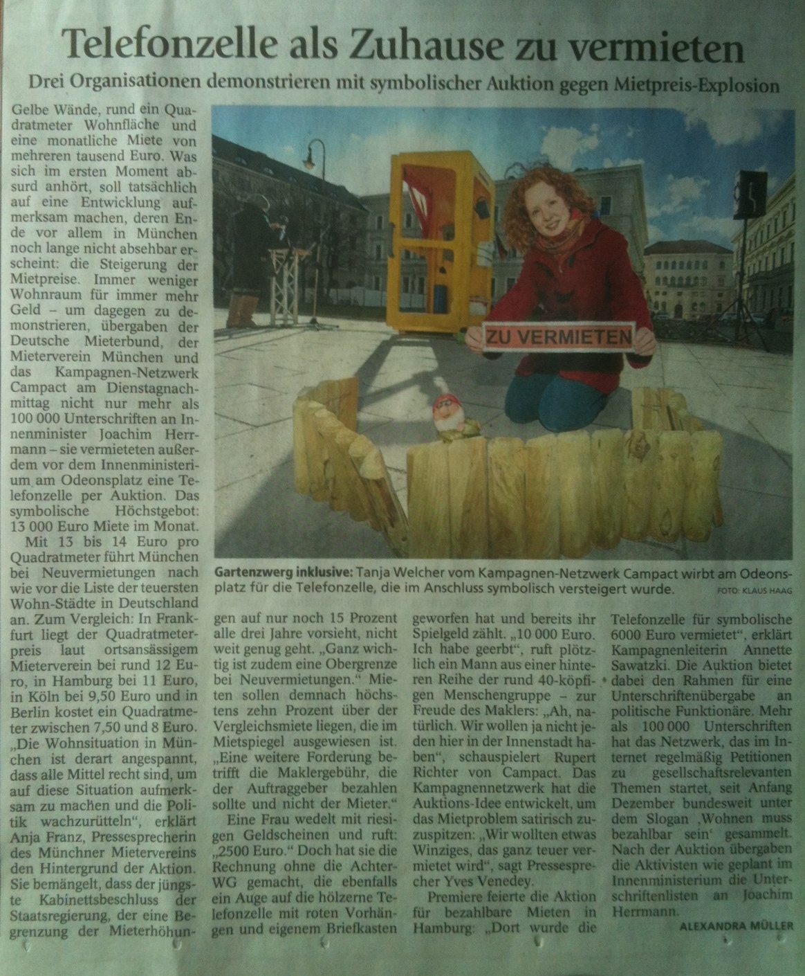 In feudaler Lage, direkt unter dem König-Ludwig-Denkmal auf dem Odeonsplatz, haben wir unsere „mobile Wohneinheit“ aufgestellt: eine gelbe Telefonzelle, ausgestattet mit Gießkannen-Dusche, Isomatte und Camping-Klo. Sie illustriert den dramatischen Mangel an bezahlbarem Wohnraum und wird, wie bei immer mehr Neuvermietungen üblich, im Höchstpreis-Verfahren „versteigert“. Rund 50 Münchner/innen haben sich dazu eingefunden, darunter auch Beatrix Zurek, Vorsitzende des Münchner Mietervereins, und Monika Schmid-Balzert, die den bayrischen Landesverband des Deutschen Mieterbunds vertritt.