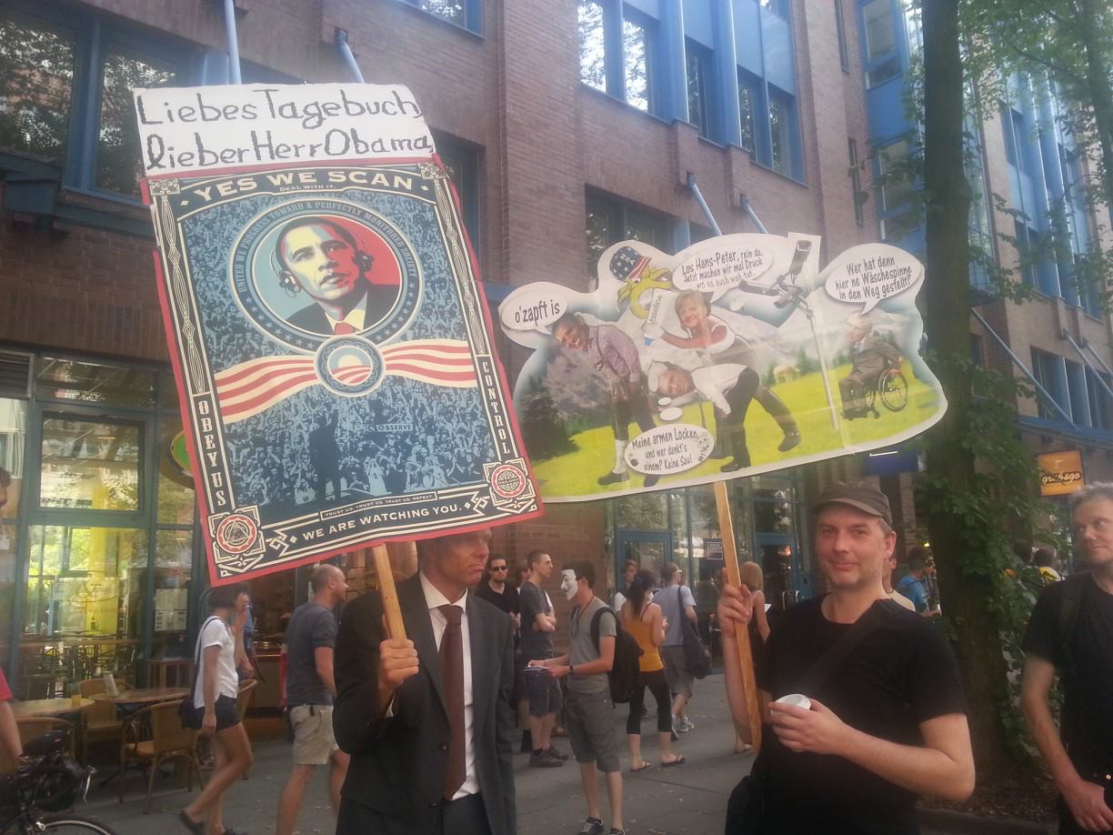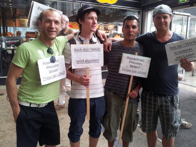 „Nur wer Angst vor Freiheit hat, braucht den Überwachungsstaat“ und „Aushorchen im ganzen Land, unsre Antwort Widerstand!“ skandierten die Demonstranten. Und das bei einer Affenhitze, gegen die sie sich mit Kopfbedeckungen aus Alu-Folie schützten. So twitterte Yves Venedey, Pressesprecher von Campact aus Berlin „Schwitzen gegen Prism bei 39 Grad“. Trotz der Rekordtemperaturen und der Organisation nach „Chaosprinzip“ gingen Tausende Menschen in ihren jeweiligen Städten auf die Straße.