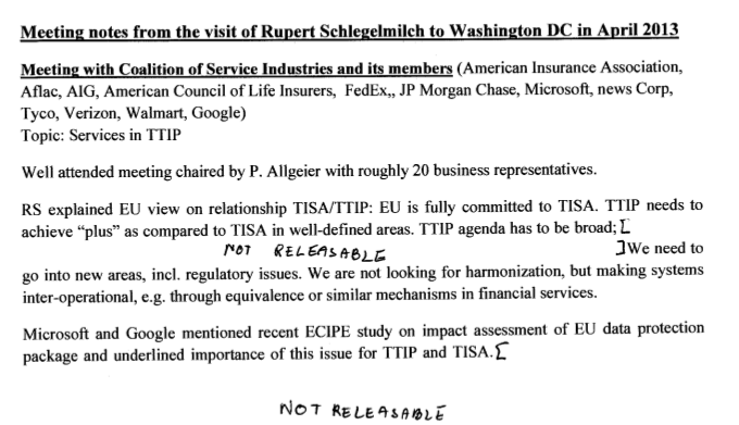 Datenschutz gehört offiziell nicht zum Verhandlungsmandat der EU-Kommission. Hinter verschlossenen Türen wird jedoch bereitwillig über den „freien Fluss“ der Daten beraten. Für US-Regierung und Unternehmen stellt das europäische Datenschutzrecht ein Handelshemmnis dar. Das neue EU-Datenschutzrecht, das derzeit verhandelt und noch der EU-Wahl verabschiedet werden wird, sieht noch stärkere Beschränkungen vor. Und das aus gutem Grund. Schließlich schnorcheln Geheimdienste wie die NSA, wie die Enthüllungen des Hinweisgebers Edward Snowden gezeigt haben, bei auch US-Unternehmen hemmungslos Daten von EU-Bürgern ab.