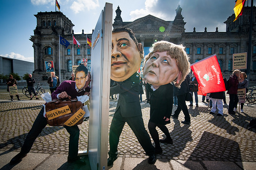 Vor dem Reichstag lieferten Merkel und Gabriel heute unfreiwillig eine filmreife Show ab: Mit viel Kraft und allerlei Tricks versuchten sie Edward Snowden aus dem Untersuchungsausschuss auszusperren. Die beiden Politiker hielten mit aller Kraft eine Tür zu, vor der Edward Snowden mit einem Koffer voll Aussagen und Dokumenten stand und verzweifelt klopfte.