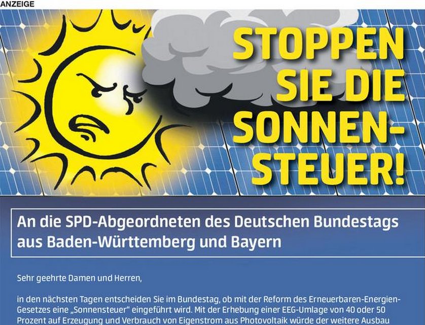 Die Anzeige wird die Abgeordneten sicherlich nochmal zum Nachdenken gebracht haben. Diese Woche müssen sie im Bundestag über die Sonnensteuer entscheiden. Sprich darüber, ob der Ausbau der Solarenergie mit der Erhebung einer EEG-Umlage auf die Erzeugung und den Verbrauch von solarem Eigenstrom abgewürgt wird. Die SPD-Abgeordneten aus dem Süden stehen mittlerweile völlig isoliert da. Alle Abgeordneten der CDU-Landesgruppe aus Baden-Württemberg haben sich vorletzte Woche in einem Brief klar gegen die Sonnensteuer gestellt – und damit an die Seite der CSU, die die unsinnige „Steuer“ verhindern will.