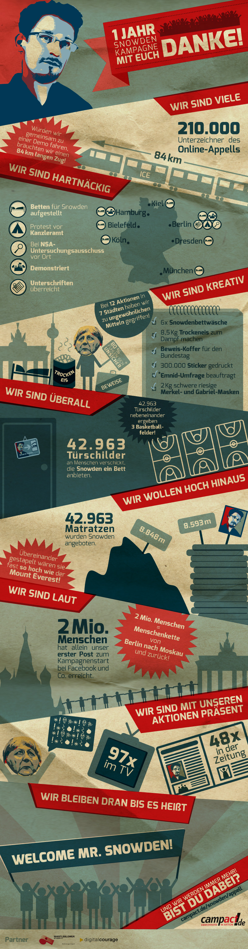 Diese Kampagne lebt von jedem Einzelnen. Wir sind 210.000 und wir werden mehr. Daher: Verbreite den Appell, setze Dich weiter für Snowden ein und mache mit bei Protestaktionen vor Ort. Wir lassen Snowden nicht im Stich!