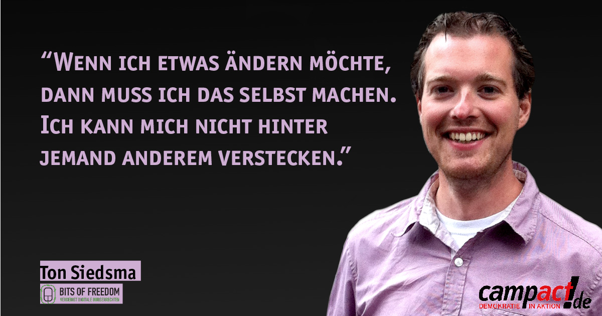 Ton Siedsma: Ich erwarte von der Politik klare Datenschutz-Regeln und vor allem Mechanismen, um diese Regeln in der Praxis durchzusetzen. Ich erwarte, dass die Systematik hinter den Geheimdiensten überdacht wird. Einschließlich der Regeln zu Transparenz, Kontrolle der Geheimdienste und Benachrichtigung bei Überwachungsmaßnahmen. Trotzdem weiß ich, dass Politik nur einen Teil der Lösung liefern kann.