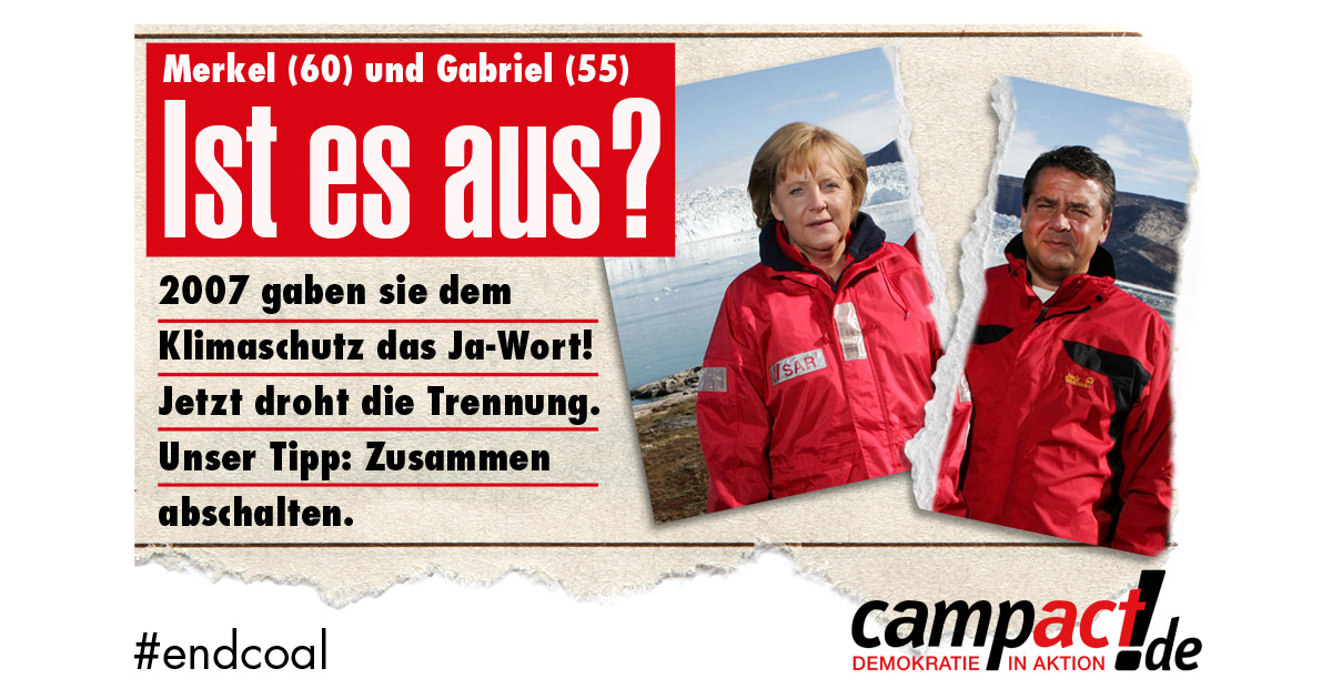 Angesehene Paartherapeuten raten: Mit dem grauen Alltag brechen, einfach mal zusammen abschalten. Dem schließen wir uns an: Gabriel und Merkel müssen jetzt die dreckigsten und ältesten Kohlekraftwerke vom Netz nehmen – und einen langfristigen Ehevertrag zu schließen. Nur mit einem Kohleausstiegsgesetz kann sichergestellt werden, dass auch im Falle einer Trennung der beiden mit der Kohle spätestens 2040 Schluss ist.