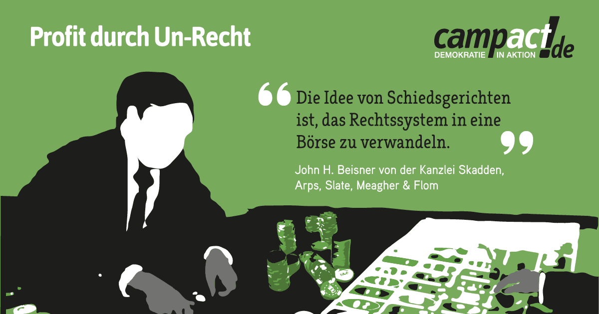 Derzeit wird Deutschland vom schwedischen Unternehmen Vattenfall in einem Investor-Staat-Schiedsverfahren auf Schadensersatz von 4,7 Milliarden Euro für den Atomausstieg verklagt. Schon vor der Entscheidung kostet diese Klage die Steuerzahler bisher 8 Millionen Euro Anwaltskosten. Ein glänzendes Geschäft mit dem Un-Recht.