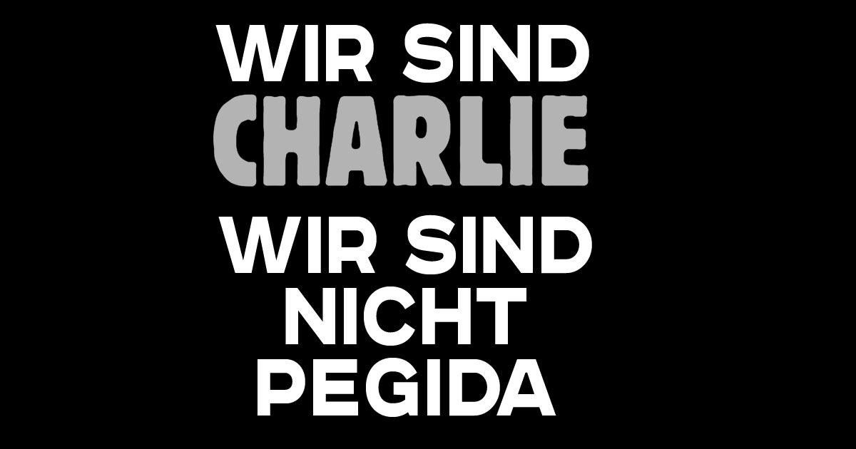 Bringen Sie gerne ein Schild mit unserer Aktionsgrafik “Wir sind Charlie – wir sind nicht Pegida!“ zur Demo mit. Sie können es ganz einfach herunterladen und mit Ihrem Drucker oder beim nächsten Copy-Shop ausdrucken. Drucken Sie doch gleich ein paar weitere Exemplare aus und verteilen Sie diese auf der Demo.
