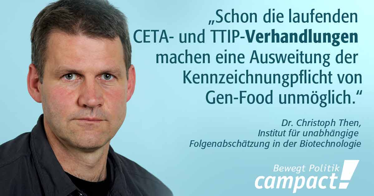 Dr. Christoph ThenDer EU-Kommissar Andriukaitis hat auch gesagt, dass bisherige Standards der Kennzeichnungspflicht nicht angetastet würden. Da darf man aber nicht zu naiv sein. Die Standards werden sich mit oder ohne TTIP und CETA immer weiter verschlechtern, sei es durch gesetzliche Veränderungen, durch Anpassungen an technische Entwicklungen oder eben durch Klagen von Verbrauchern und Konzernen. Es wird also immer Veränderungen geben, nur dass unter TTIP und CETA diese Entwicklung dann nicht mehr offen transparent ist – die bisherigen Standards werden ganz erheblich unter Druck geraten und letztlich abgesenkt.
