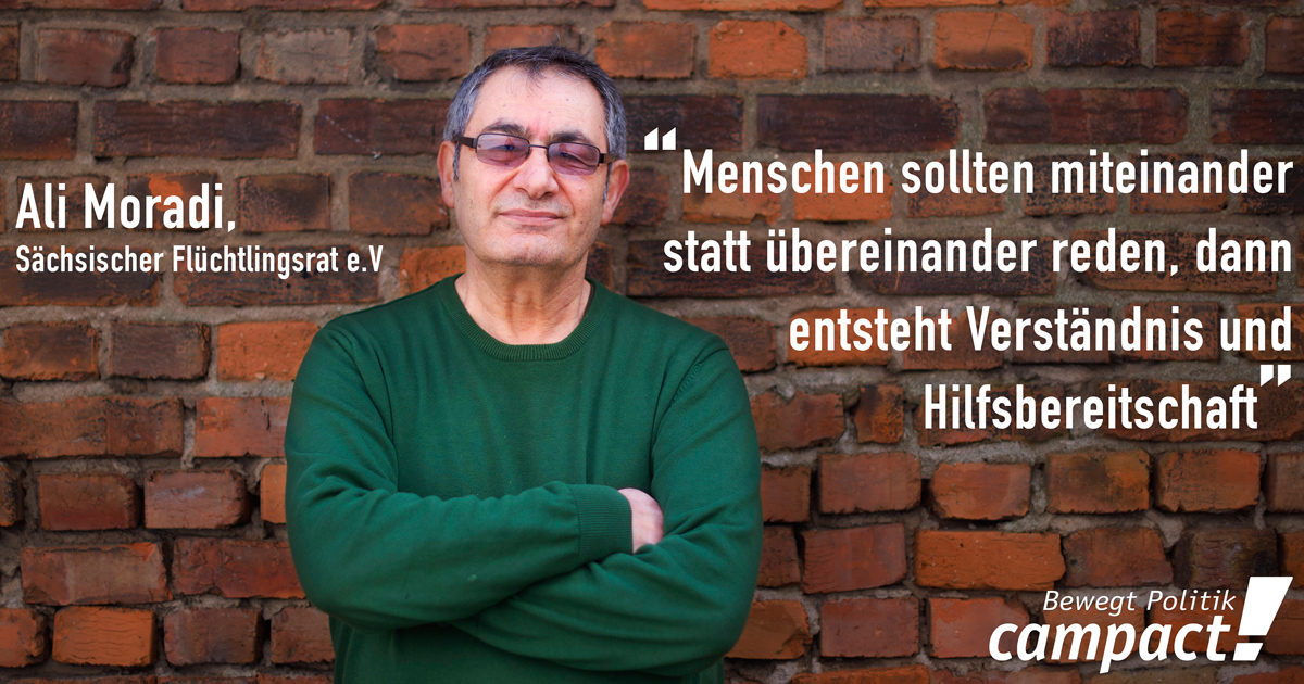 Ali Moradi formuliert es ganz einfach: “Menschen sollten miteinander statt übereinander reden, dann entsteht Verständnis und Hilfsbereitschaft.” Er geht dahin, wo in Dresden und Umgebung Unterkünfte für Flüchtlinge entstehen sollen, wo die NPD versucht, die Verunsicherung von Menschen in Hass zu verwandeln. Ali Moradi weiß wie es sich anfühlt, als Asylsuchender nach Deutschland zu kommen, weiß wie es ist, in einer Gemeinschaftsunterkunft zu wohnen und mit welchen Schwierigkeiten man sich konfrontiert sieht.