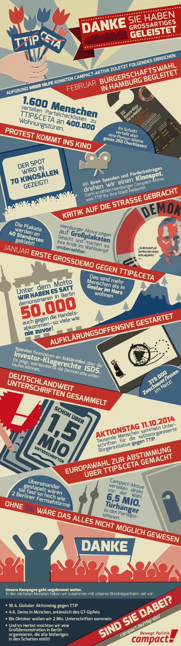 Wir brauchen einen langen Atem, um die Handelsabkommen mit den USA und Kanada zu stoppen. Das schaffen wir nur dank der Unterstützung zahlreicher Campact-Förderer/innen. Bitte hilf auch Du durch einen regelmäßigen Beitrag, dass wir Kampagnen wie zu TTIP und CETA gemeinsam zum Erfolg führen können. Dafür einfach hier klicken: