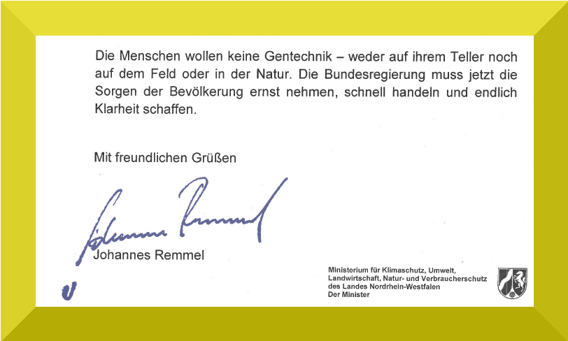 Die Bundesländer Nordrhein-Westfalen, Schleswig-Holstein, Niedersachsen, Rheinland-Pfalz, Hessen, Thüringen und Baden-Württemberg sind nun mit einem Gegenentwurf im Bundesrat vorgeprescht. Ihre Forderung: Statt einem Flickenteppich soll es ausschließlich bundesweite Anbauverbote geben. Warum, erklärte uns der nordrhein-westfälische Landwirtschaftsminister Johannes Remmel (Grünen) in einem persönlichen Brief an Campact. Der Minister betont, dass er die Kritik des Appells teilt: