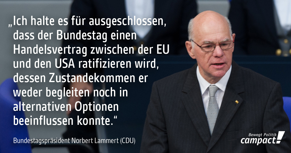Entgegen bisheriger Versprechen lässt die EU-Kommission die Abgeordneten des Deutschen Bundestages keinerlei TTIP-Dokumente einsehen. Dem Präsidenten des Bundestages Norbert Lammert (CDU) wird das jetzt zu bunt und er droht offen mit der Ablehnung des Vertrags. Er halte es für ausgeschlossen, dass der Bundestag einen Handelsvertrag zwischen der EU und den USA ratifiziere, dessen Zustandekommen er weder begleiten noch beeinflussen könne.