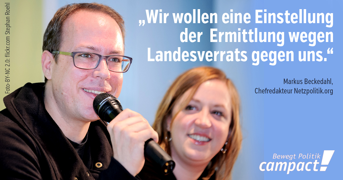 Mehr als 125.000 Campact-Aktive haben den Solidaritäts-Appell für die beiden mutigen Journalisten mitgezeichnet. Viele Campact-Aktive haben bei der großen Solidaritäts-Demo am 1. August in Berlin für die Pressefreiheit mitdemonstriert. Damit haben wir als Teil einer großen Bewegung eine rote Linie zur Verteidigung der Pressefreiheit gezogen. Diese gemeinsame Protestwelle einer breiten Zivilgesellschaft fegte schließlich Generalbundesanwalt Range aus dem Amt und führte zu einer schnellen Einstellung der Ermittlungen. Die Beendigung der Ermittlungen gegen die Journalisten und ihre Quellen, sind ein wichtiger Etappensieg für die Pressefreiheit.