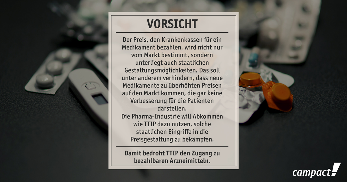 Handels- und Investitionsschutzabkommen wie TTIP und CETA gefährden nicht nur Umwelt- und Verbraucherschutzstandards, sondern auch unsere Gesundheit. Mit ihnen wird die ohnehin schon große Einflussnahme der Pharma-Lobby regelrecht institutionalisiert, die Versorgung mit Arzneimitteln droht, kaum noch finanzierbar und Gesundheit zur bloßen Handelsware zu werden. Solidarische Gesundheitssysteme geraten unter Druck und der Gestaltungsspielraum für demokratische Gesundheitspolitik wird ausgehöhlt.