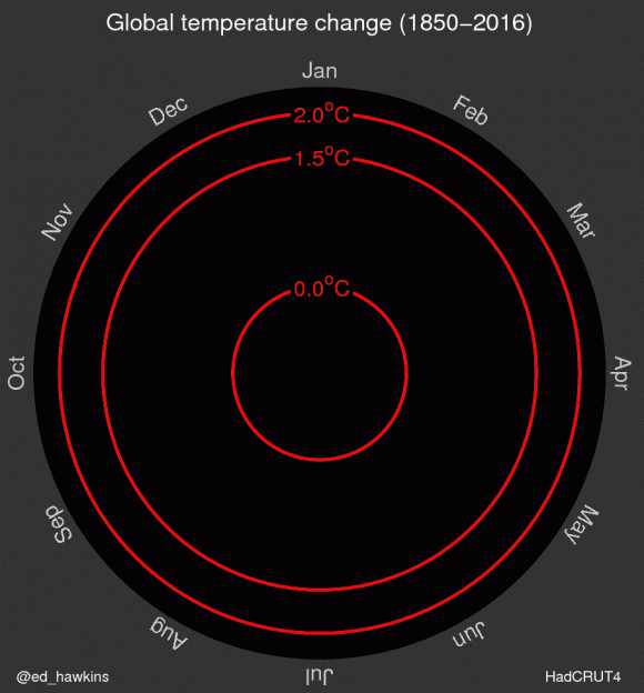 Diese Grafik hat es in sich. Über 14.000 mal wurde sie auf Twitter geteilt. Was sie zeigt? Im Uhrzeigersinn durchläuft eine Spirale die Monate des Jahres – vom Januar 1850 bis zum März 2016. Sie zeigt den Anstieg der weltweiten Mitteltemperatur. Der rote Null-Kreis ist die Basislinie aus der Zeit der frühen Industrialisierung: die globale Temperatur im Mittel der Jahre 1850-1900.