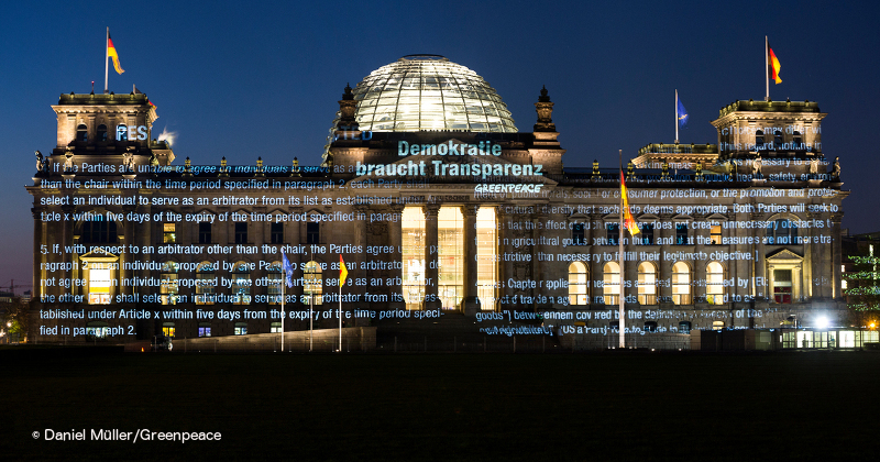 Mit diesem Leak hatte keiner gerechnet: Kurz nach dem Besuch von US-Präsident Barack Obama bei der Hannover-Messe und der TTIP-Verhandlungsrunde in New York, veröffentlicht Greenpeace Teile der geheimen Verhandlungs-Papiere(1). 240 Seiten, die zeigen: Der Druck der US-Regierung auf die EU ist stärker und weitreichender als bislang bekannt. Außerdem platzierte Greenpeace einen TTIP-Leseraum auf dem Platz des 18. März in Berlin. Der gläserne Container aus Plexiglas ist für alle Bürger/innen zugänglich.
