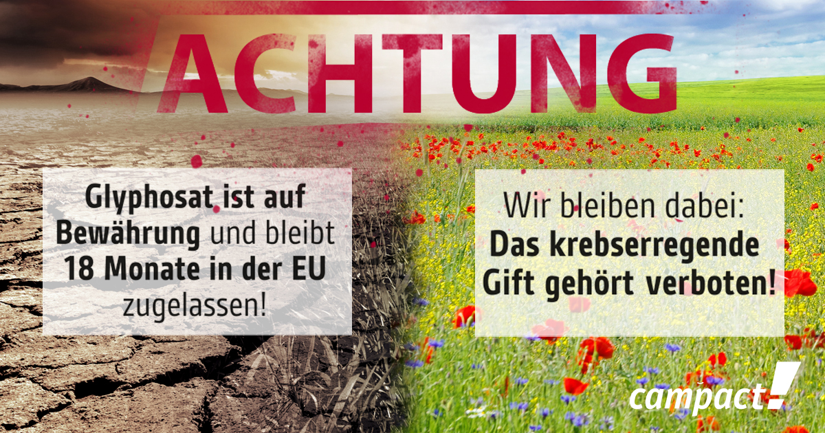 Zur Erinnerung: Eigentlich hatte die EU-Kommission eine Genehmigung für 15 Jahre vorgeschlagen – fand dafür aber keine ausreichende Mehrheit der EU-Staaten. Dass die Glyphosat-Genehmigung jetzt nur für 18 Monate anstatt 15 Jahre verlängert wird, ist auch ein Erfolg unserer europaweit koordinierten Proteste.