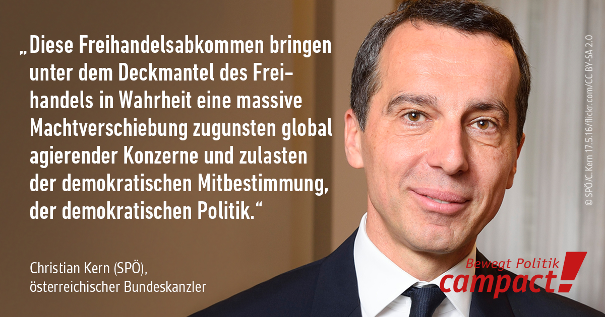 Christian Kern, österreichischer Bundeskanzler und Sozialdemokrat (SPÖ), hat es in der vergangenen Woche gut auf den Punkt gebracht: bei den Freihandelsabkommen CETA und TTIP geht es nicht nur um Handel. Sie bringen unter dem Deckmantel des Freihandels eine massive Machtverschiebung zugunsten global agierender Konzerne und zulasten der Demokratie. Und er ergänzt: „Das ist ein grundsätzlicher Webfehler.“