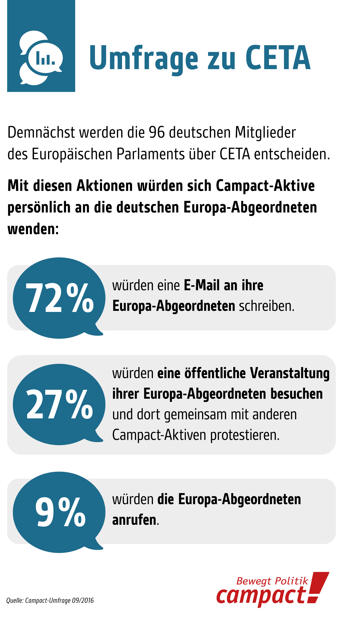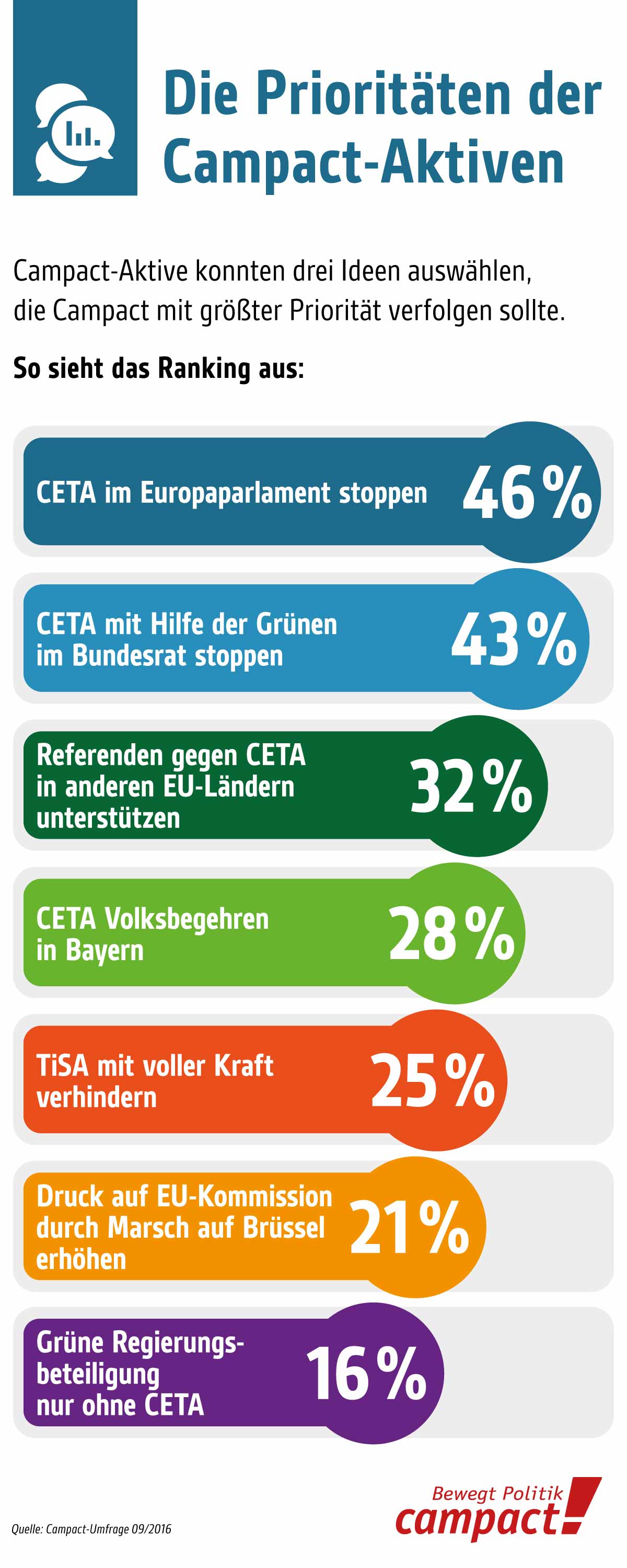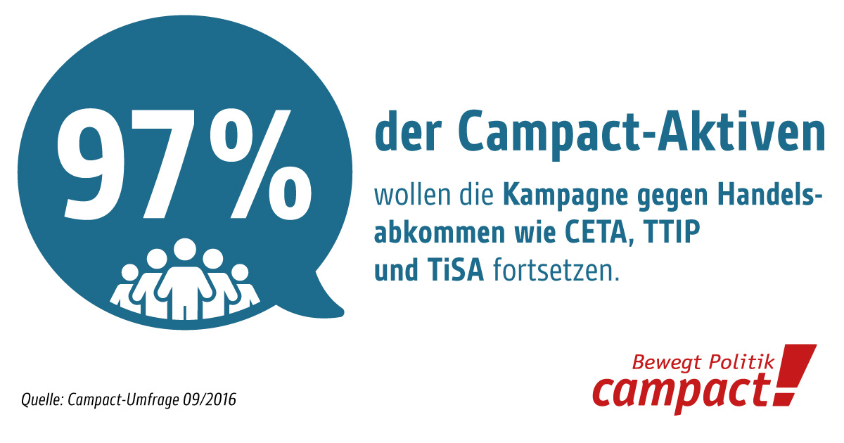 Das erste und wichtigste Ergebnis aus der Umfrage ist eindeutig: Die Campact-Aktiven wollen mit überwältigender Mehrheit von 97 Prozent, dass wir die Kampagnen gegen Abkommen wie TTIP, CETA und TiSA fortführen.