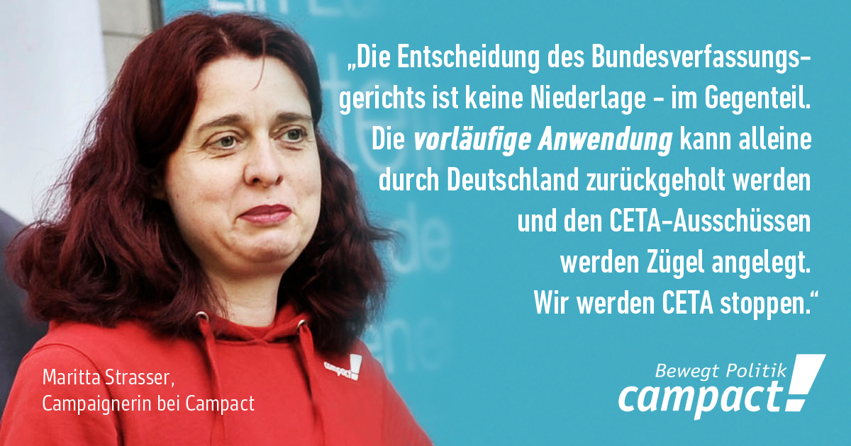 Klar ist: Wir lassen uns nicht verunsichern! Und CETA steht ab jetzt unter verschärfter Beobachtung des Bundesverfassungsgerichts. Das bietet neue Chancen, die wir uns nicht entgehen lassen!