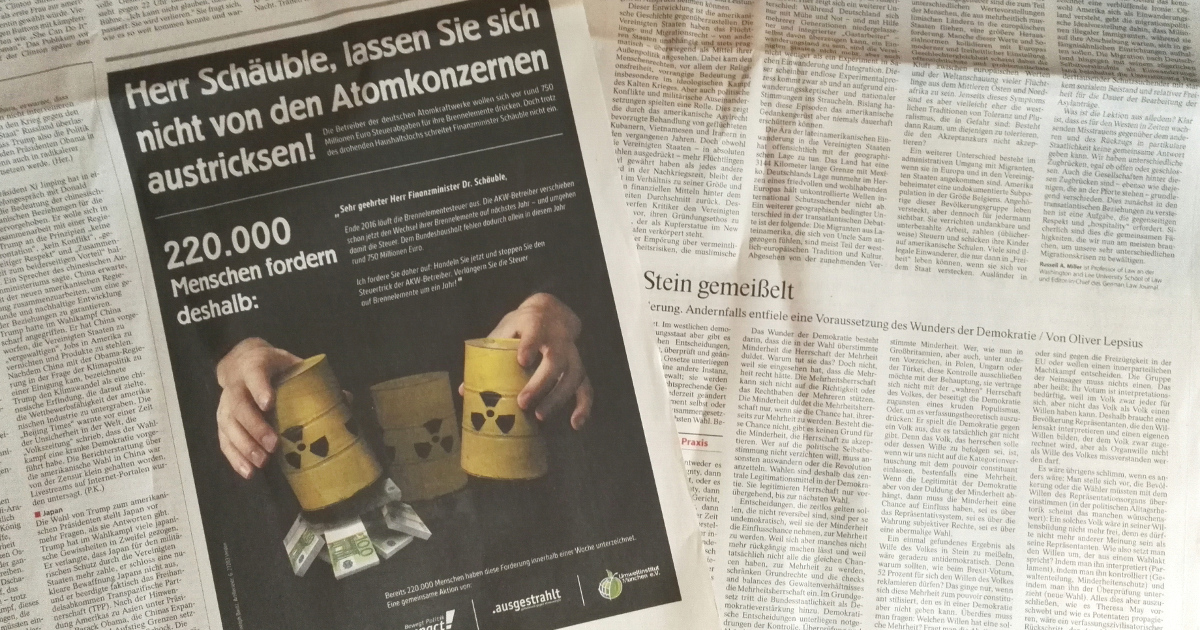 Mit einem Appell und einer Aktion vor dem Finanzministerium haben wir schon letzte Woche begonnen, den Trick der Atomkonzerne öffentlich zu machen. Und damit die Botschaft auch in der CDU ankommt, haben wir sie diese Woche mit unserer Anzeige in der Frankfurter Allgemeinen Zeitung (FAZ) auf tausende Frühstückstafeln und Schreibtische gebracht. Unzählige konservative Leser erfahren nun unübersehbar auf Seite fünf des Politik-Teils: Schäuble hat seinen Haushalt nicht im Griff. So wächst der Druck auf den Finanzminister, zu handeln.