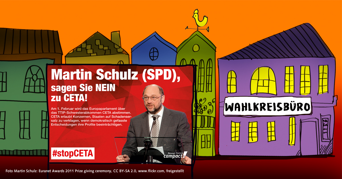 Dass kreatives Bürgerengagement auch im Europaparlament wirkt, haben wir gemeinsam gerade bewiesen. Eigentlich wollten die CETA-Fans das Abkommen dort hopplahopp durchbringen. Doch tausende Mails, Briefe und Faxe von Campact-Unterstützer/innen haben die beiden federführenden SPD-Köpfe Martin Schulz und Bernd Lange zum Umdenken gebracht.