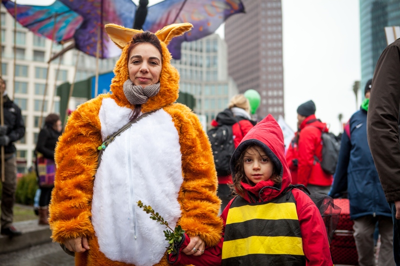 Eine große Menschenmenge – viele verkleidet als Kuh, Schwein oder Huhn – zog vom Potsdamer Platz Richtung Brandenburger Tor. Über 18.000 Menschen trotzten am vergangenen Samstag den eisigen Temperaturen und hielten sich mit lauten Sprechchören warm. Zehn übergroße Schmetterlinge flohen vor einer noch riesigeren Monsanto-Giftflasche. Doch Aktive warfen sich gemeinsam mit Hase, Bienen und Maiskolben schützend davor. Was wir am Samstag spielerisch darstellten, ist leider bittere Realität. Monsanto, Bayer und weitere Agrarkonzerne bedrohen die Natur und gefährden damit unsere Gesundheit mit Glyphosat und Gentechnik.