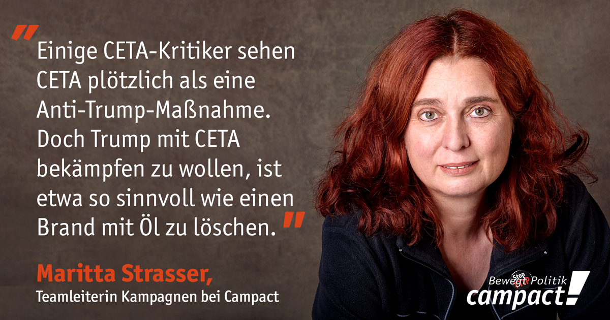 Als Antwort darauf setzt die EU-Kommission weiterhin auf CETA und viele weitere Handelsabkommen, die mit dem Ziel verhandelt werden, Exporte zu steigern. Dass sie ihrer Linie treu bleibt, ist wenig verwunderlich. Erschreckend ist, dass jetzt auch einige CETA-Kritiker das Abkommen plötzlich als eine Anti-Trump-Maßnahme sehen. Das ist verrückt: Mit CETA Trump bekämpfen zu wollen, ist etwa so sinnvoll wie einen Brand mit Öl zu löschen.