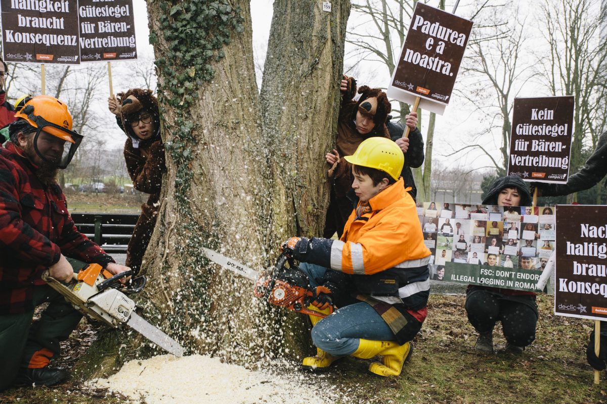 Mit lautem Dröhnen springt der Motor an, und im nächsten Moment legen Holzfäller ihre Kettensäge an die Bäume im Freizeitpark Rheinaue. Sägemehl wirbelt durch die Luft, während Bären hinter den Bäumen Schutz suchen. Mit dieser Aktion holen wir den dramatischen Alltag in rumänischen Wäldern vor die Zentrale des Forest Stewardship Council (FSC) nach Bonn – denn die Organisation könnte jetzt ein klares Zeichen gegen Bären-Vertreibung setzen. 20 Aktive sind zur Aktion gekommen – und zwei Campaignerinnen unserer rumänischen Schwesterorganisation de-clic.