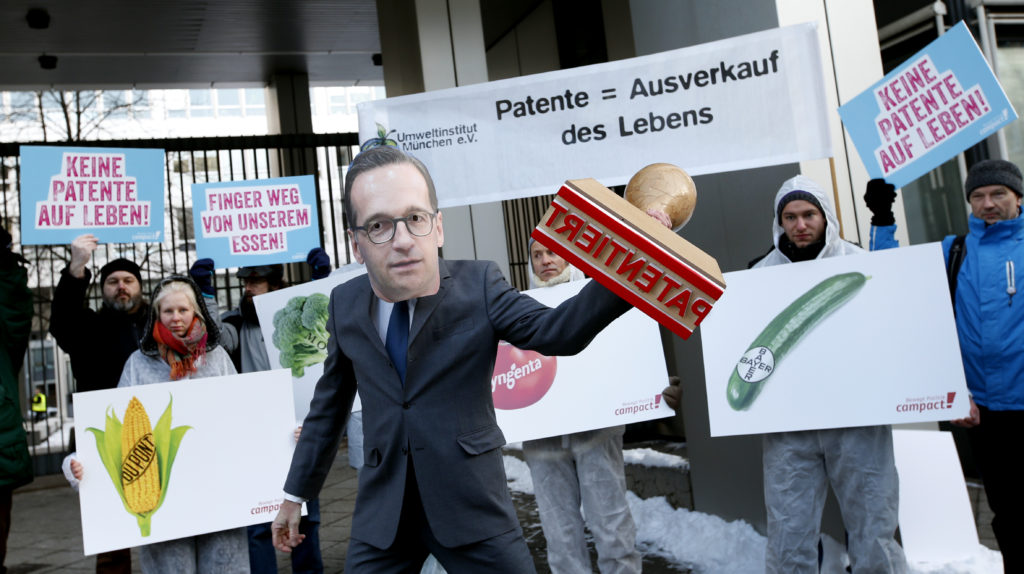 Während die Beamt/innen in München über ein Melonen-Patent für Monsanto entschieden, waren wir vor Ort: Vor dem Amtsgebäude drückte ein Campact-Aktiver mit einer Heiko-Maas-Maske übergroßem Obst und Gemüse einen riesigen “Patentiert”-Stempel auf.