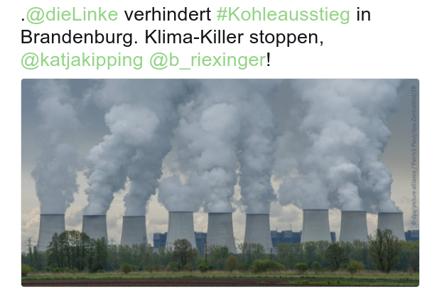 Die Reaktion der Linken-Spitze kam prompt: Nur Stunden nach Beginn unserer Aktion gaben Kipping, Riexinger und der Brandenburger Linken-Vorsitzende Christian Görke vor der Presse und auf Facebook ein gemeinsames Statement ab. „Mit der LINKEN gibt es kein Zurück beim Klimaschutz“, erklärten sie. Das klingt gut – doch bei näherem Hinsehen erweist sich der Satz leider als windelweich. Und zwar aus folgenden Gründen: