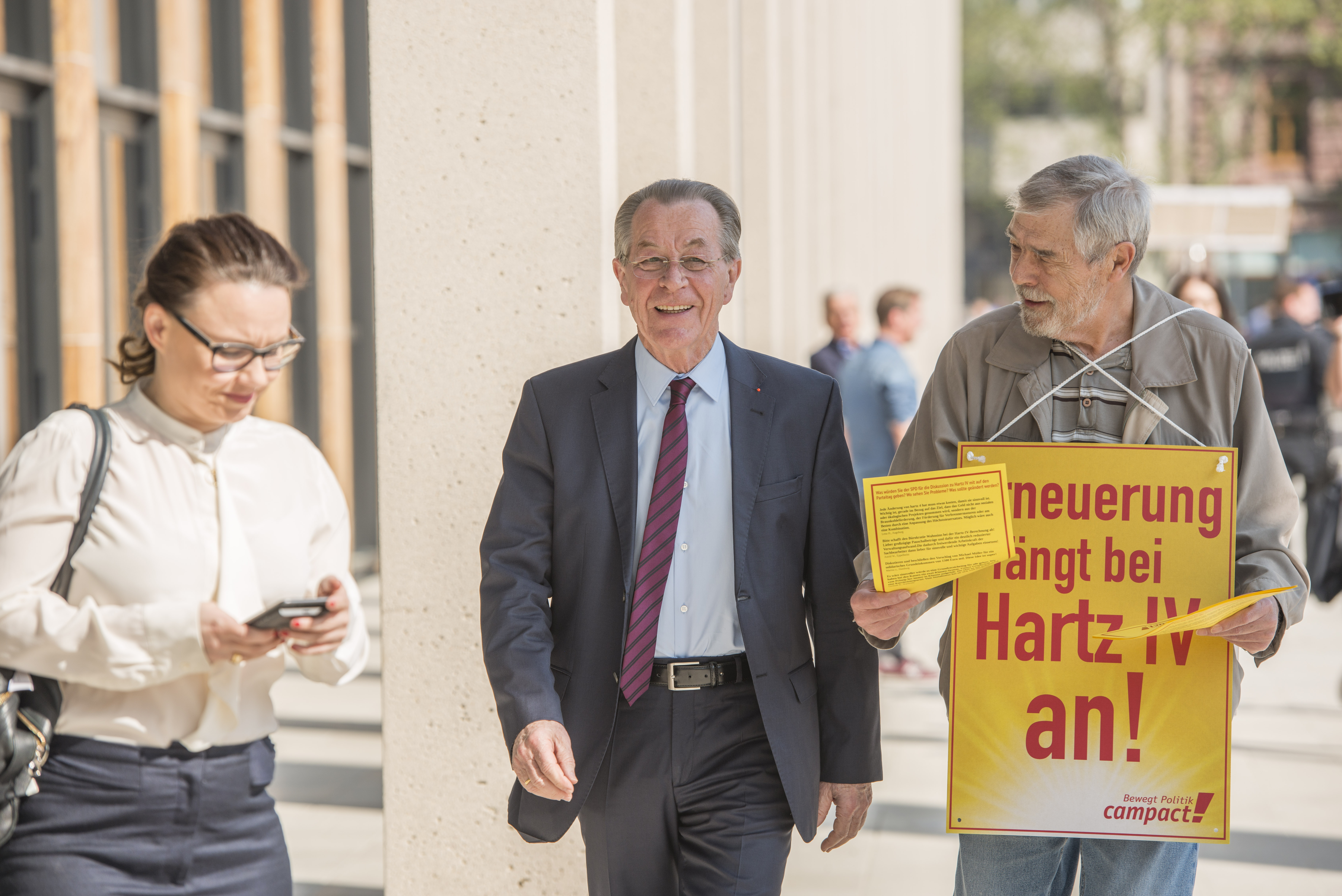 Die Aktion vor dem neuen Rhein-Main-Congresszentrum in Wiesbaden lief prächtig: Die meisten Delegierten nahmen die Flyer und Energieriegel dankend entgegen – darunter prominente Politiker/innen wie Malu Dreyer, Kurt Beck oder Karl Lauterbach. Mehrere Sozialdemokraten versicherten uns, dass sie beim Thema Hartz IV ganz auf unserer Seite stehen. Sogar die Nachrichtenagentur dpa berichtete über unsere Aktion – damit hatten wir nicht gerechnet.