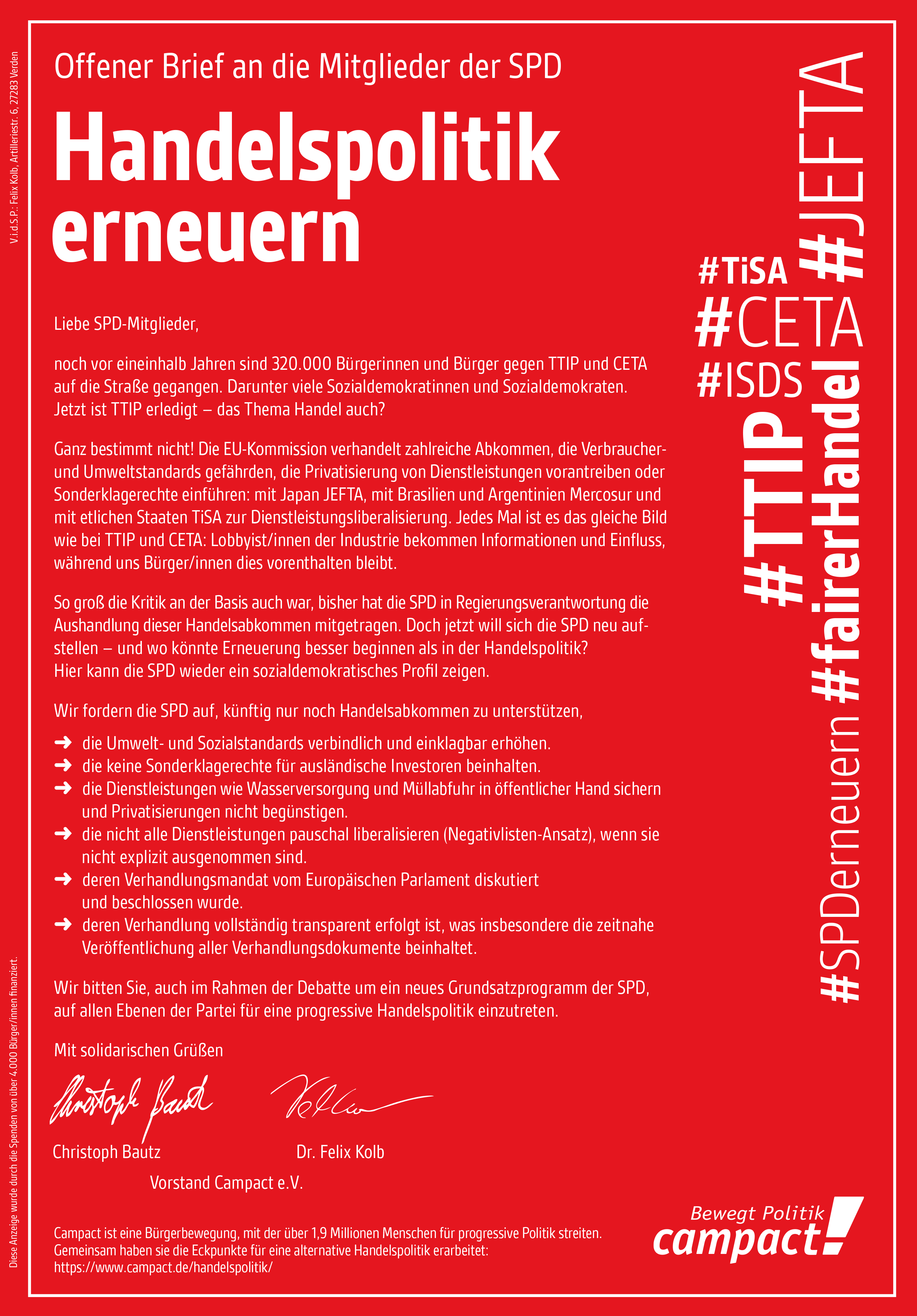 In unserem Brief fordern wir die SPD auf, nur noch Handelsabkommen zu unterstützen,