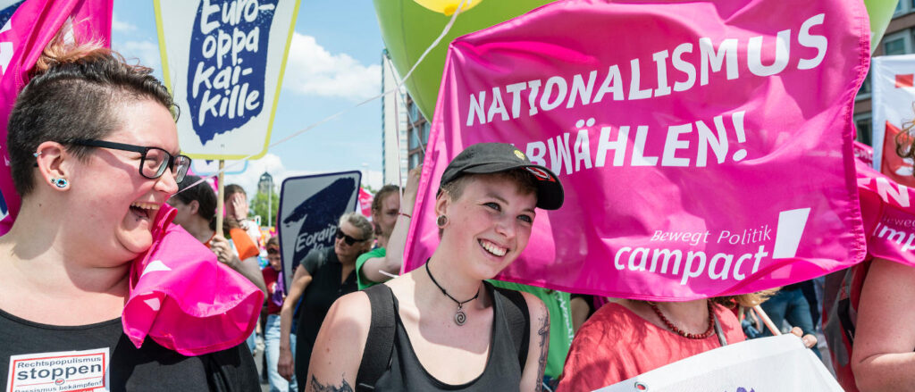 Die europäische Zivilgesellschaft ist bunt, stark und engagiert: Das bewiesen Campact-Unterstützer*innen gemeinsam mit vielen Europäer*innen am 19. Mai – kurz vor der Europawahl. Von Malmö bis München, von Berlin bis Bukarest: In 50 Städten gingen Menschen auf die Straße. Sie protestierten, sangen und tanzten für ein besseres Europa, gegen Nationalismus. Allein in Deutschland waren 150.000 unterwegs.