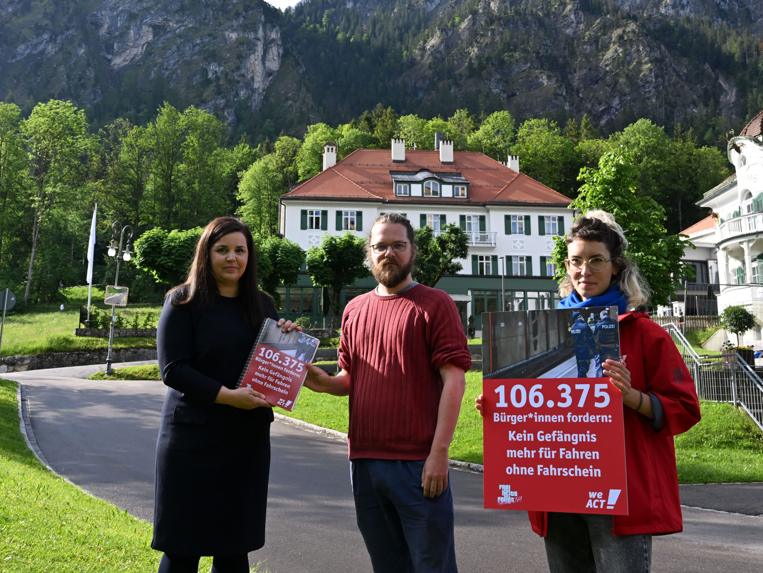Bei der Protestaktion im Allgäu hat Arne Semsrott die Forderungen aus der WeAct-Petition an die Verantwortlichen übergeben – mit über 100.000 Unterstützer*innen im Rücken. Der bayerische Staatsminister Georg Eisenreich (CSU) als Vorsitzender der Justizministerkonferenz sowie die Berliner Justizministerin Lena Kreck (Linke) und die Hamburger Justizministerin Anna Gallina (Grüne) nahmen die Unterschriften entgegen.