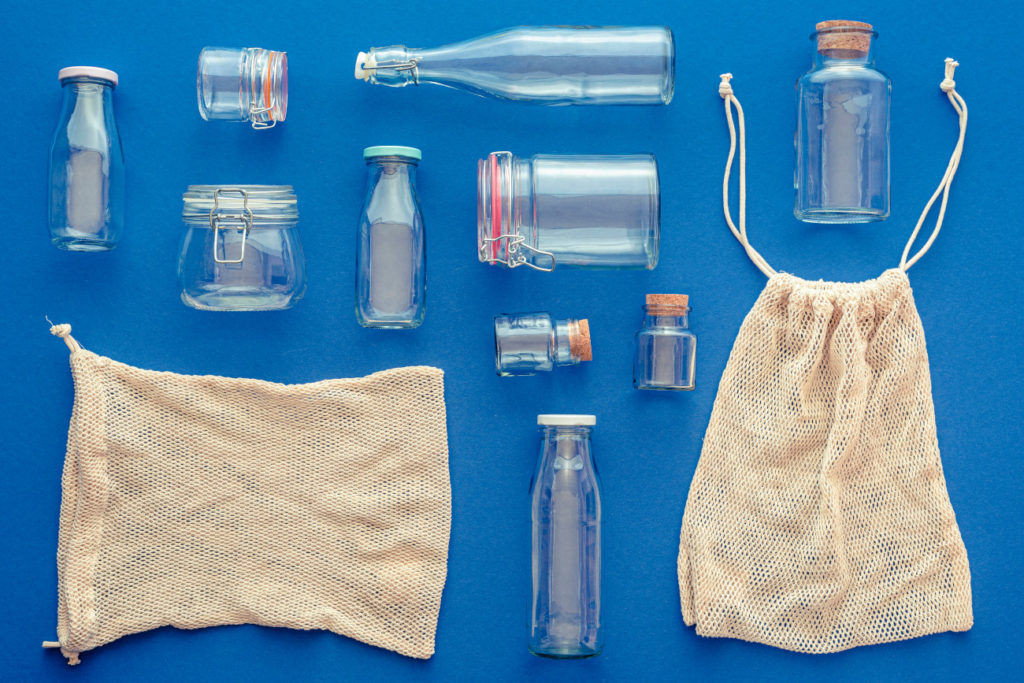 Marmeladen- oder Einmachgläser, kleine Flaschen, ein Gemüsenetz und ein Brotbeutel sind ein guter Start für einen verpackungsfreien Einkauf. Foto: IMAGO