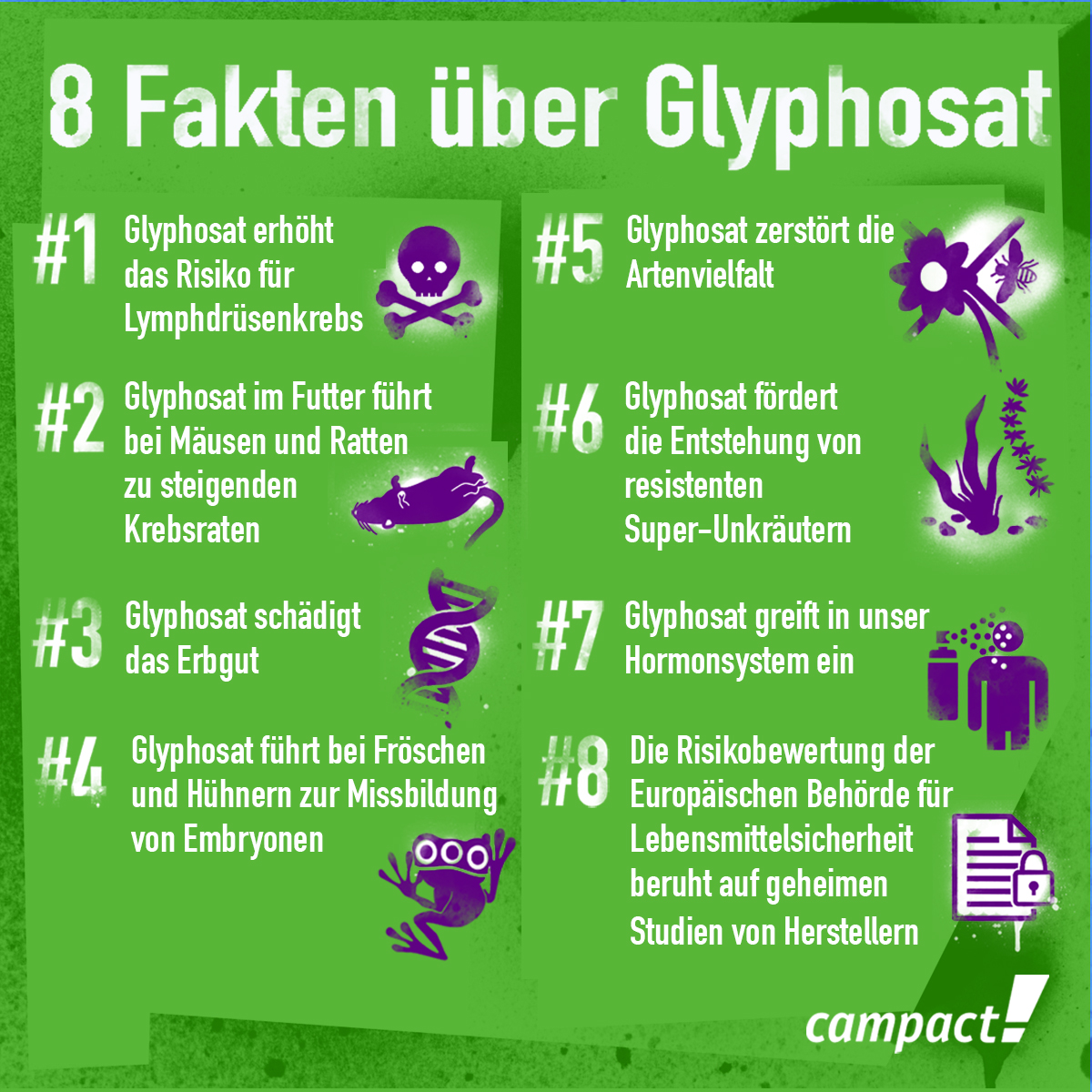 Die Glyphosat-Hersteller beteuern immer wieder, das Pflanzengift sei nicht gefährlich. In der Öffentlichkeit kursieren allerlei Fehlinformationen und Halbwahrheiten zu dem Pestizid – sei es zu Gesundheitsgefahren oder Gefährdung der Umwelt. Es ging sogar schon so weit, dass die für die Risikobewertung zuständigen Behörden wichtige wissenschaftliche Erkenntnisse ignorierten. Dazu beriefen sie sich auch noch zu einem großen Teil auf geheime Studien der Hersteller. Dabei gibt es genug wissenschaftliche Erkenntnisse zu Glyphosat, die belegen, dass das Pflanzengift gefährlich ist. Wir haben hier die acht wichtigsten Fakten zusammengestellt.