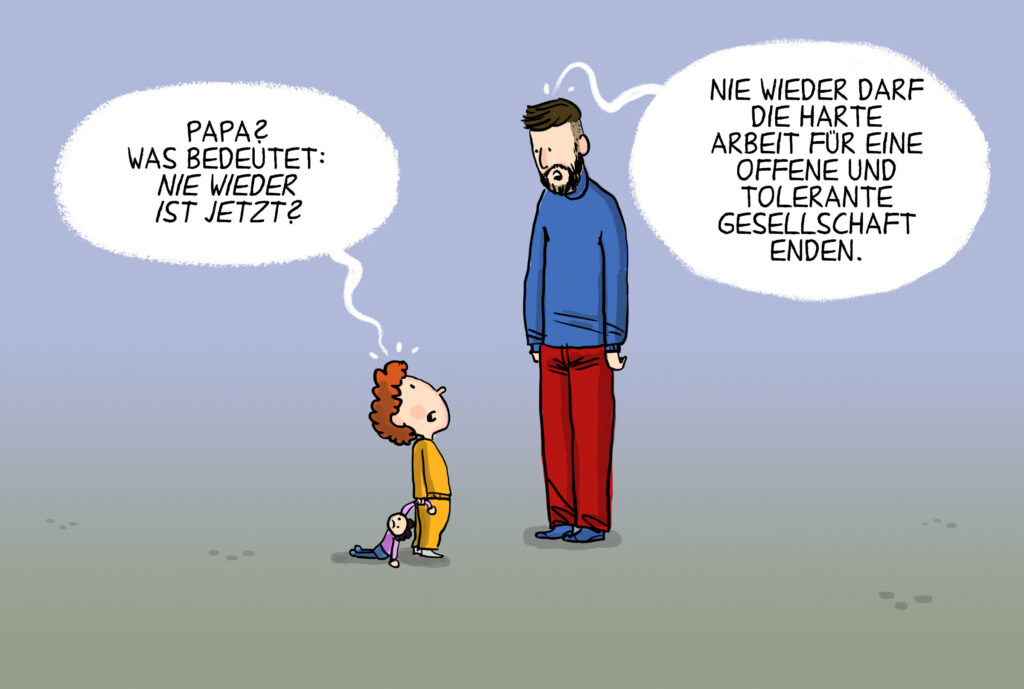 Deutschlands Versprechen „Nie wieder!” bröckelt. Eine offene, plurale Gesellschaft ist kein Selbstläufer – sie erfordert Haltung und Einsatz. Das wird auch in Leopold Maurers Karikatur deutlich.