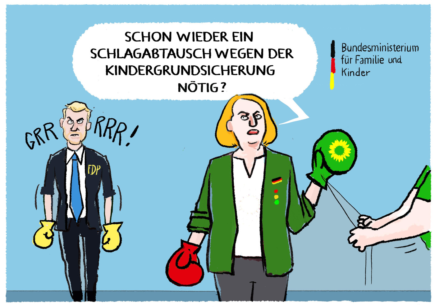 In jeder Verhandlungsrunde stößt sich die FDP an einem anderen Punkt. Stellenweise wirkt die Debatte wie ein richtiger Boxkampf – so stellt es auch Karikaturist Markus Grolik in seiner Karikatur dar. Der jüngste Kritikpunkt, über den sich die FDP übereifrig echauffiert, ist der Umfang der zusätzlichen Stellen, die für einen reibungslosen bürokratischen Ablauf notwendig sind. Die geplante Kindergrundsicherung entwickelt sich so zu einem zentralen Streit-Thema der Ampelkoalition.