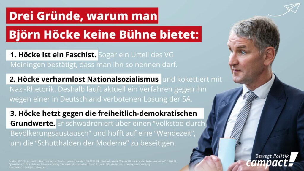 Dazu kommt, dass es in dem TV-Duell nur wenig um Landespolitik ging, obwohl der Anlass ja die am 1. September anstehende Landtagswahl in Thüringen war. Die Themen der Bürgerinnen und Bürgern aus Thüringen sollten für die beiden Politiker also eigentlich oberste Priorität haben. Stattdessen ging es um emotional aufgeladene, bundespolitische Themen, Allgemeinplätze und den Krieg in der Ukraine. Die beste Bühne für den nicht einheimischen Extremisten Björn Höcke (er kommt aus Nordrhein-Westfalen), um seine Gedanken zu präsentieren.