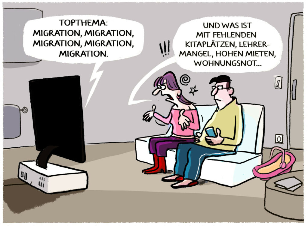 Was vor lauter Empörung und Unmut dabei nicht beachtet wird: Die Debatte spielt vor allem Rechtsextremen und Faschisten in die Karten. Denn die hängen sich mit einer „Haben wir doch schon immer gesagt“-Haltung an diese Diskussion und positionieren ihre menschenverachtenden Ideen als valide Lösungen für die vermeintliche Migrationskrise. Was das bewirken kann, ist an den Ergebnissen der Landtagswahlen in Thüringen und Sachsen zu sehen. Dabei gibt es in Deutschland gerade so viele wichtigere Themen. Das betont auch der Karikaturist Markus Grolik in seiner neuen Karikatur. Wohnungsnot, hohe Mieten, fehlende Kita-Plätze und Lehrer*innen sollten gerade viel eher die drängenden Themen sein. Stattdessen wird einer menschenverachtenden, von rechts befeuerten Debatte um eine vermeintliche Migrationskrise Raum gegeben.