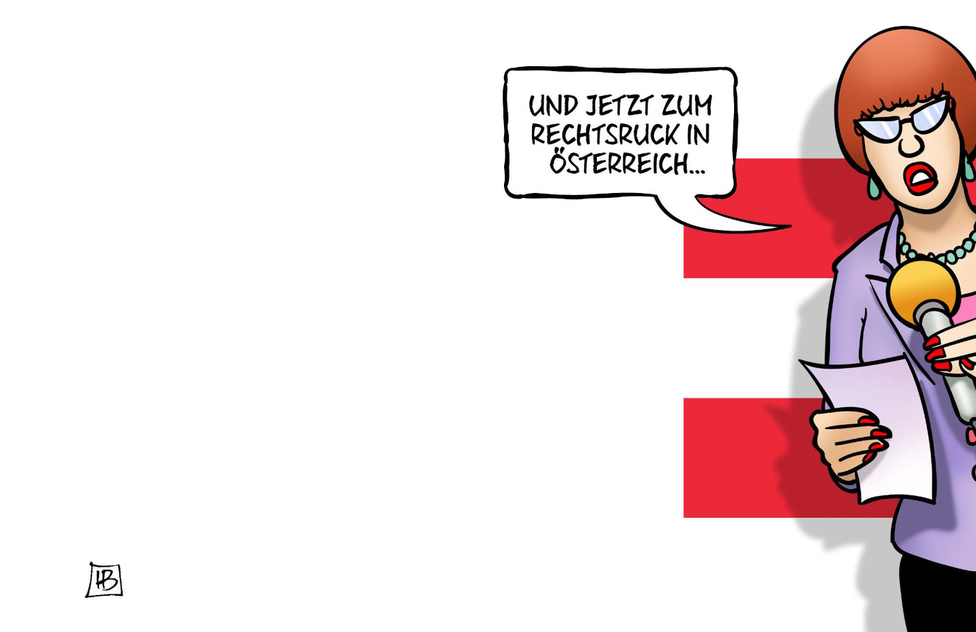 Zum ersten Mal in der Geschichte der Republik ist die rechte FPÖ stärkste Partei im österreichischen Parlament. Noch nie waren ÖVP und SPÖ zeitgleich so schwach, für die Sozialdemokraten ist es ein historisch schlechtes Resultat. Auch die ÖVP verbuchte eines ihrer schlechtesten Wahlergebnisse. Karikaturist Harm Bengen zeigt diese Entwicklung auch seiner aktuellen Karikatur: Österreich ist so weit rechts wie nie zuvor; so weit rechts, dass selbst die Nachrichtenreporterin vom rechten Bildrand aus moderiert.