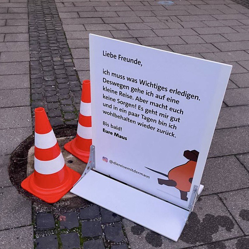 Dienstagmorgen am Vierscheibenhaus des WDR in Köln: Die Maus-Statue ist verschwunden, zurückbleibt ein Schild: „Liebe Freunde, ich muss was Wichtiges erledigen. Deswegen gehe ich auf eine kleine Reise. Aber macht euch keine Sorgen! Es geht mir gut und in ein paar Tagen bin ich wohlbehalten wieder zurück.“