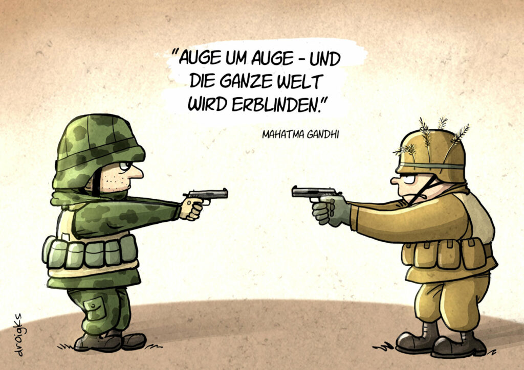 Karikaturist „droigks“ kommentiert diese aktuellen Debatten mit seiner neuen Karikatur – und einem Zitat von Mahatma Gandhi zum Thema Krieg: „Auge um Auge – und die ganze Welt wird erblinden.“