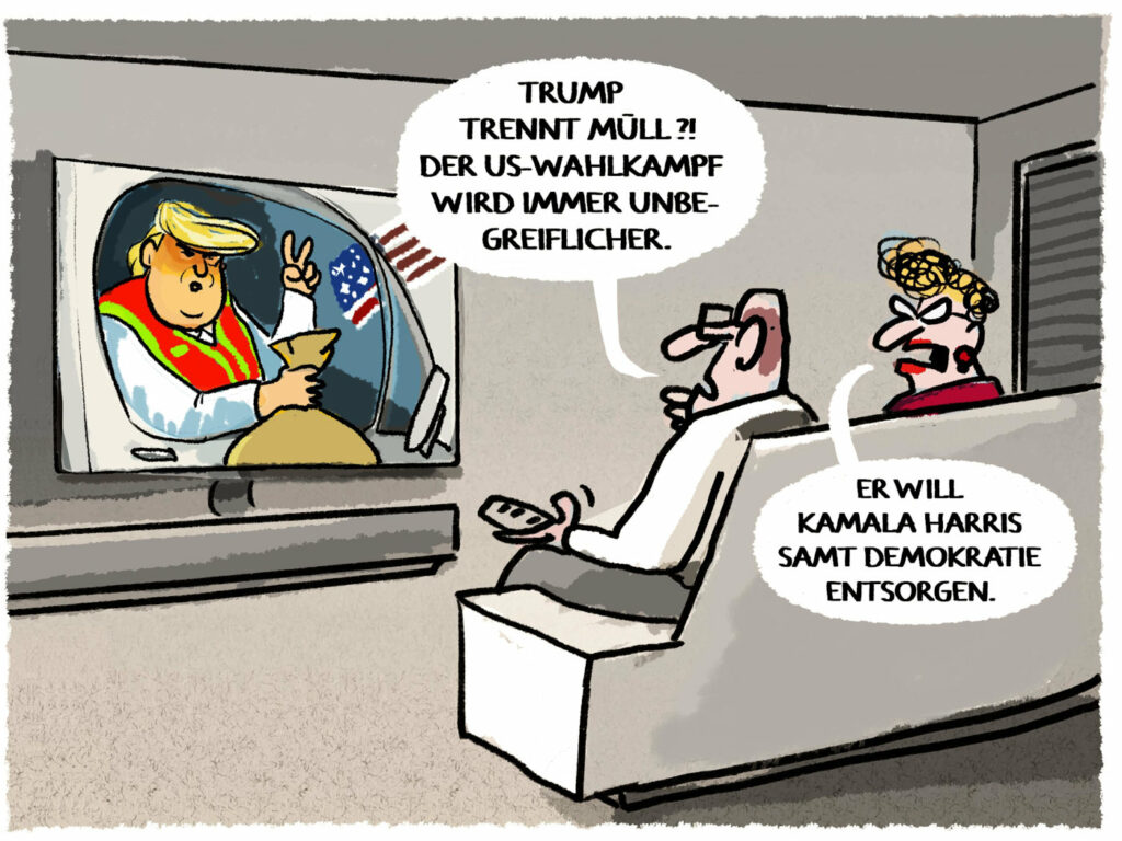 Der Wahlkampf in den USA geht in den Endspurt: Am Dienstag, dem 5. November, wählen die US-Bürger*innen ein neues Staatsoberhaupt. Die Kandidatin der Demokraten Kamala Harris ist damit beschäftigt, einen verbalen Fehltritt des scheidenden US-Präsidenten Joe Biden auszubügeln: Er hatte Anhänger von Trump bzw. ihre rassistischen Äußerungen augenscheinlich als „trash“ (dts. Müll) bezeichnet. Das nutzte der Kandidat der Republikaner, Geschäftsmann und Ex-Präsident Donald Trump, aus und präsentierte sich bei einer Fahrt in einem Müllwagen. Die Figuren in der Karikatur von Markus Grolik geben sich darüber nur halbwegs erstaunt. Womöglich möchte Trump schließlich die Demokratie mitsamt Kamala Harris entsorgen, falls er gewinnt.