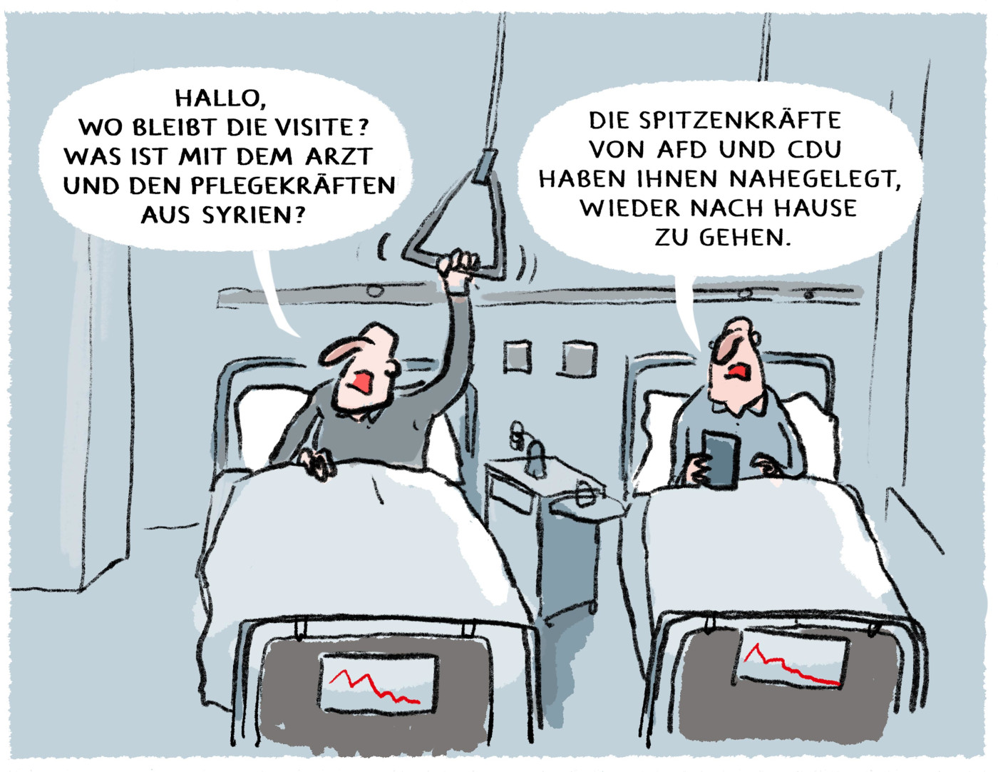 Der Diktator Assad ist gestürzt, Syrien ist endlich frei – und Politikern in Deutschland fällt nichts Besseres ein, als unverzüglich über das Schicksal der syrischen Geflüchteten in Deutschland zu sprechen. Die ersten Nachrichten über die aktuelle Lage in Syrien waren keine 24 Stunden alt, als direkt die ersten Forderungen nach einem Aufnahmestopp, Aufhebung des Schutzstatus und Abschiebungen laut wurden. Welche Folgen es zum Beispiel im Gesundheitswesen haben könnte, wenn syrische Fachkräfte in ihr Heimatland zurückkehren, thematisiert Karikaturist Markus Grolik in seiner aktuellen Karikatur.