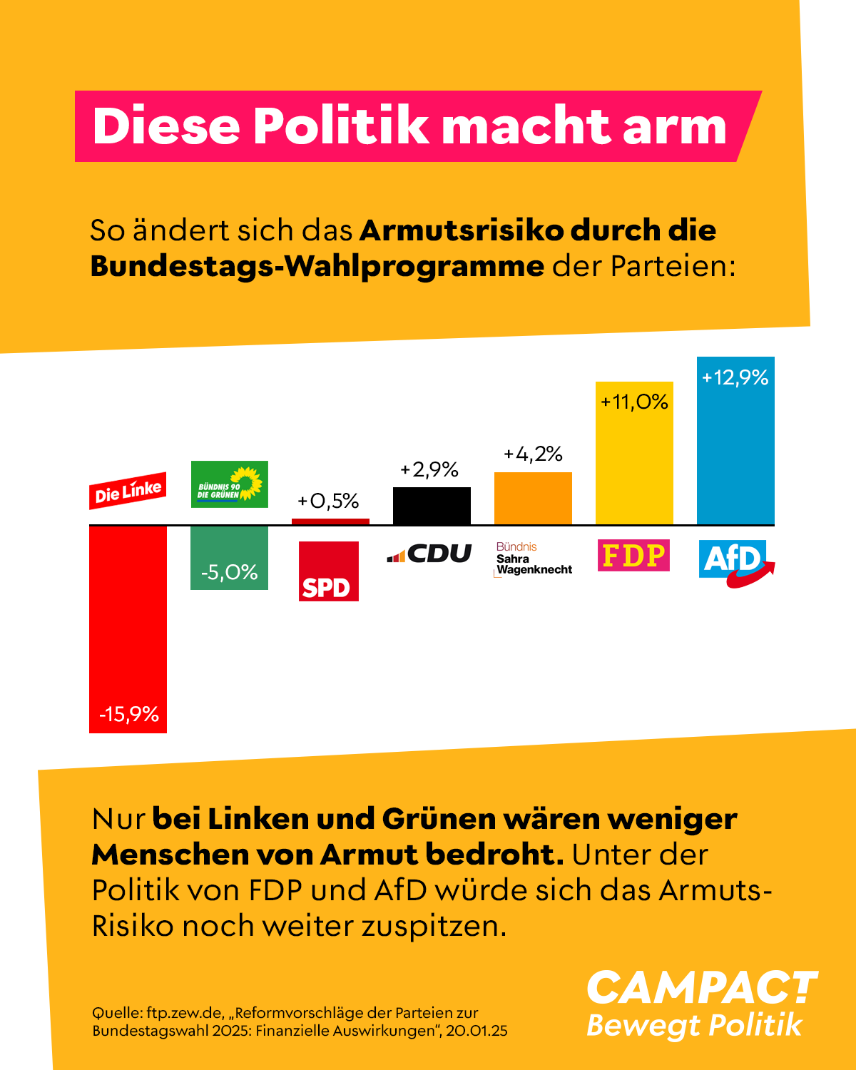 Gerade die „kleinen Leute“, die die AfD vermeintlich vertreten will, profitieren nicht von dem Programm. Im Gegenteil: Unter der AfD verschärft sich das Armutsrisiko von allen Parteien am meisten.