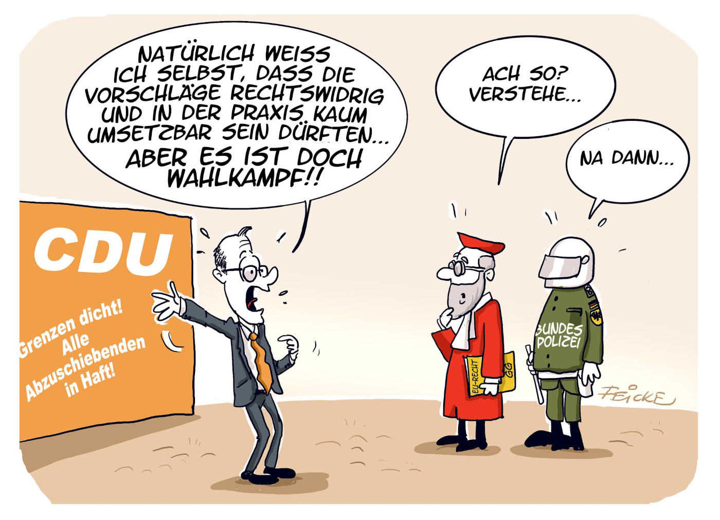 Karikaturist Tim Oliver Feicke zeigt in seiner Karikatur, was auch Rechts-Experten bisher sagen: Es ist zweifelhaft, ob die Pläne von Merz überhaupt so umsetzbar sind. An vielen Stellen kollidieren sie nämlich mit dem EU-Recht. Feicke spekuliert, dass Merz das wohl weiß – aber Polemik und Stimmenfang am rechten Rand Vorrang gibt, es ist schließlich Wahlkampf. Auch der Entzug der Staatsbürgerschaft bei Straffälligkeit von Doppelstaatlern, über den Merz schon öffentlich sinniert hat, ist rechtlich gar nicht so einfach möglich.