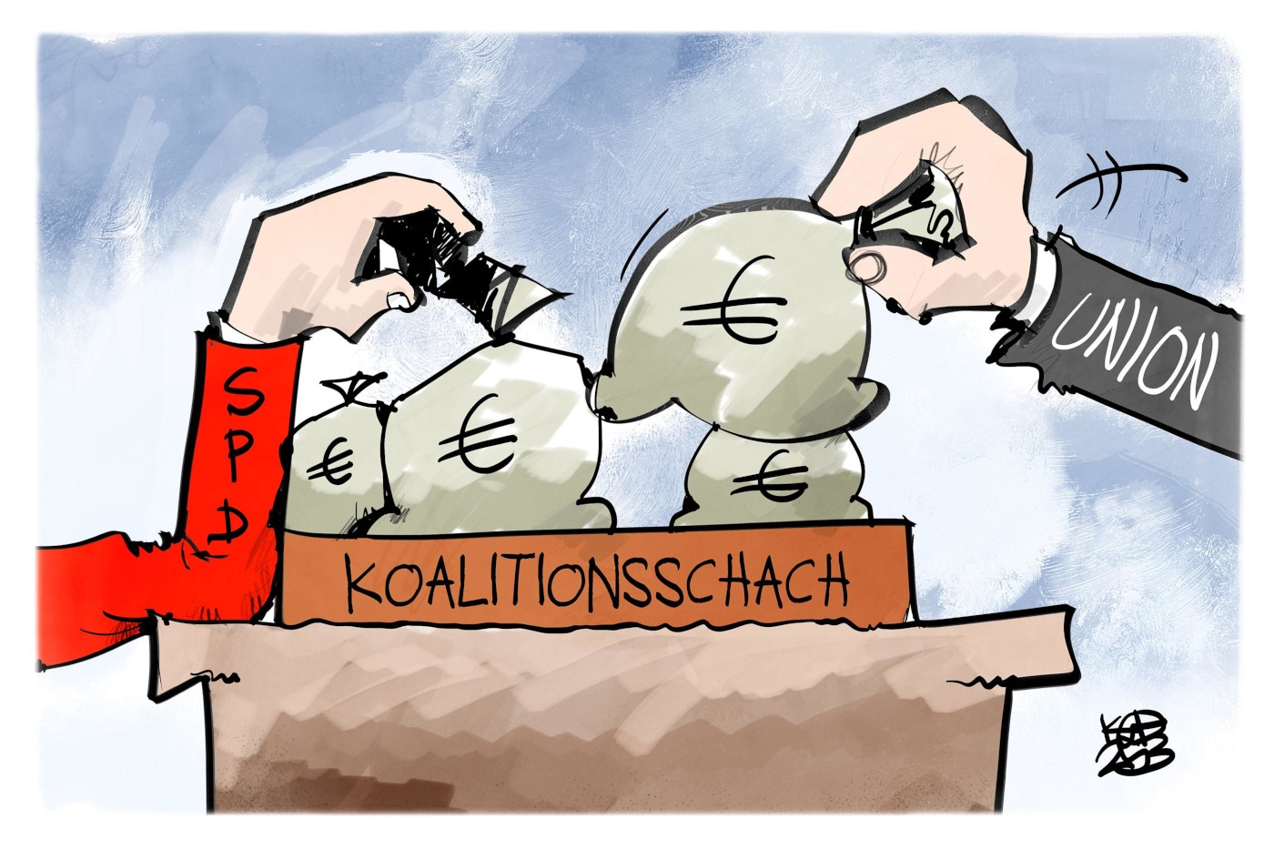 Nach den Sondierungsgesprächen in den vergangenen Wohen und nun ersten Koalitionsverhandlungen der künftigen schwarz-roten Koalition sollen die Arbeitsgruppen bis spätestens heute Nachmittag erste Ergebnisse vorlegen. Danach geht es in die „richtigen“ Koalitionsverhandlungen, in denen die wirklich strittigen Themen besprochen werden sollen. Das ganze gleicht einem Koalitionsschach, wie es Karikaturist Kostas Koufogiorgos treffend bezeichnet. „Gibst Du hier was, geb ich da was“ scheint die Devise der beiden Koalitionspartner CDU und SPD zu sein: Möglichst clever schachern, um das beste für die eigene Partei und ihre Forderungen rauszukriegen.