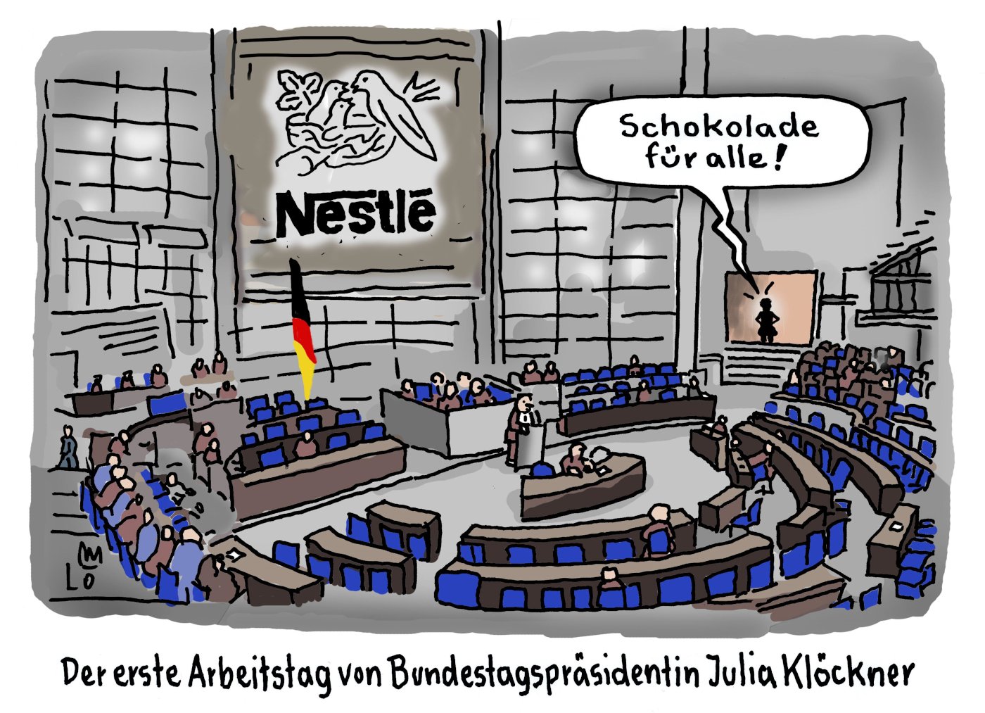 Julia Klöckner ist keine unbekannte Politikerin. Ganz im Gegenteil. Sie ist in ihrer politischen Karriere schon oft aufgefallen – nicht immer positiv. Auf einen Aspekt nimmt Karikaturist Lo Graf von Blickensdorf hier Bezug: In seiner Karikatur ist der Bundestag unter einer Bundestagspräsidentin Julia Klöckner sponsored by Nestlé. Er spielt damit auf die zweifelhaften Verbindungen der neuen Bundestagspräsidentin an, die sie während ihrer Zeit als Bundesministerin für Ernährung und Landwirtschaft in der Großen Koalition von 2018 bis 2021 hatte. Ihre politischen Vorschläge und Entscheidungen in dieser Zeit grenzten oft an Lobbyismus, da sowohl große Lebensmittelkonzerne als auch Chemie-Riesen wie Bayer und Co. von ihren Ideen profitierten. Dafür wurde sie von Campact, Foodwatch, Lobbycontrol und anderen Organisationen kritisiert. Lies hier mehr zu politischen Entscheidungen von Julia Klöckner: